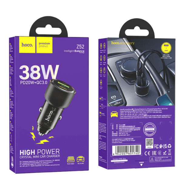 With a combined 38W total output, the Hoco Z52 38W PD QC car charger features both USB-C Power Delivery (PD) and USB-A Quick Charge (QC) ports, allowing fast charging for compatible iPhones, iPads, Samsung phones, Android devices, tablets, and more. Intelligent circuitry helps deliver stable power, while built-in protection keeps your devices safe from over-current, over-voltage, and short-circuit issues.