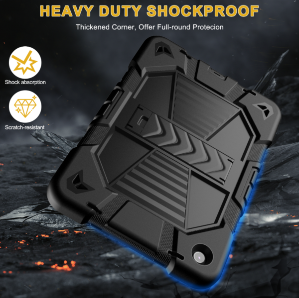 The Samsung Galaxy Tab A11+ Shockproof Rugged Armor Case with Kickstand features a strong multi-layer protective structure that combines a hard inner shell with a flexible silicone outer layer for improved shock absorption.