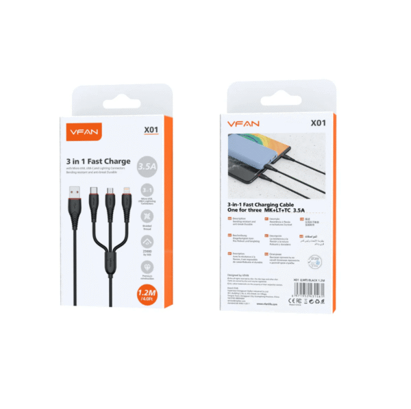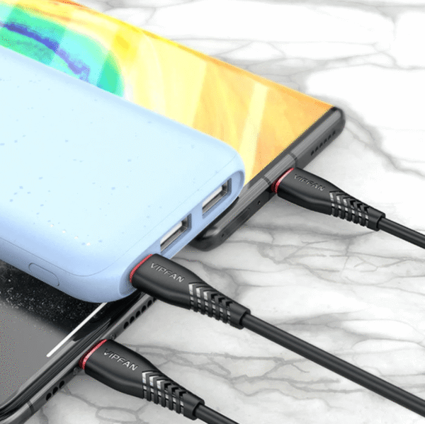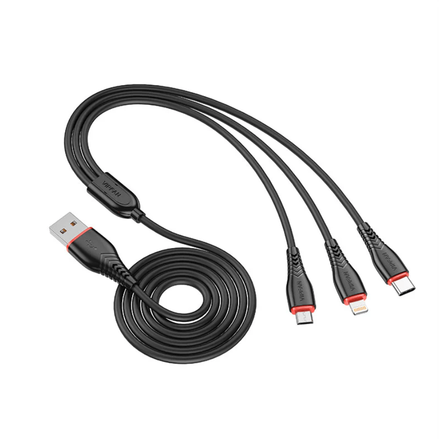 Charge multiple devices with one cable using the Vipfan X1 3 in 1 fast charge USB cable, designed for convenience, fast charging, and everyday durability. The Vipfan X1 3 in 1 fast charge USB cable includes Lightning, USB-C, and Micro USB connectors, making it a perfect all-in-one charging solution for iPhone, iPad, Android phones, tablets, power banks, Bluetooth speakers, and other devices.