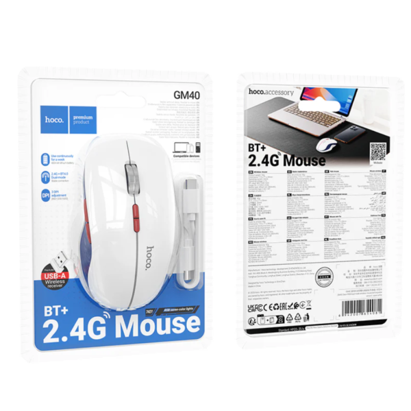 Enhance your productivity and comfort with the Ergonomic Hoco Wireless Mouse Dual Mode Bluetooth 2.4G LED 7 Button Rechargeable (GM40).